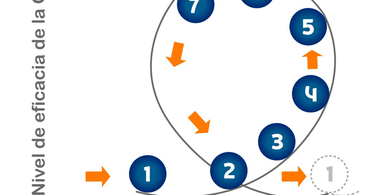 El impulso que echa a andar y sostiene el proceso de GC, es la toma de una decisión estratégica por parte de los directivos. Ello está graficado por las flechas rojas que hacen que la esfera de la gestión del conocimiento avance en cada ciclo. Cada número representa sus 7 instancias de evolución. Mientras más arriba se encuentre la esfera; mayor es el de eficacia de la GC nivel.